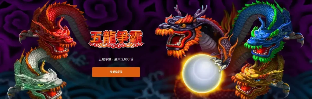 RSG電子《五龍爭霸》(Five Dragons) 是一款以中國傳統「龍文化」為主題的高人氣老虎機遊戲。五條不同顏色的龍代表著力量、榮耀、財富、吉祥與守護,每一條龍都擁有獨特的加乘功能與獎勵潛能。